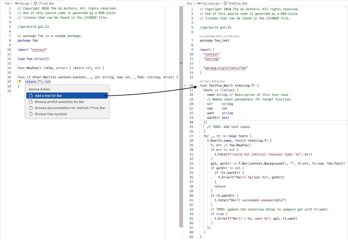 gopls предложит код-действие «Add test for F», которое добавляет новый тест для