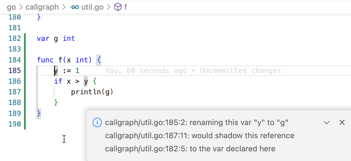 - Кандидаты для заполнения ищутся только в текущем файле и только выше текущей позиции. Символы, объявленные ниже текущей позиции, или в других файлах пакета, не рассматриваются; см. https://go.dev/issue/68224.